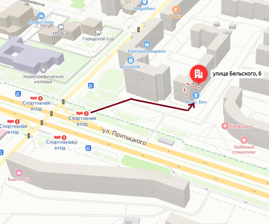 От метро Спортивная до студии 200 метров, или 2 минуты пешком. Ниже представлена карта, где схематически указано наше местоположение.